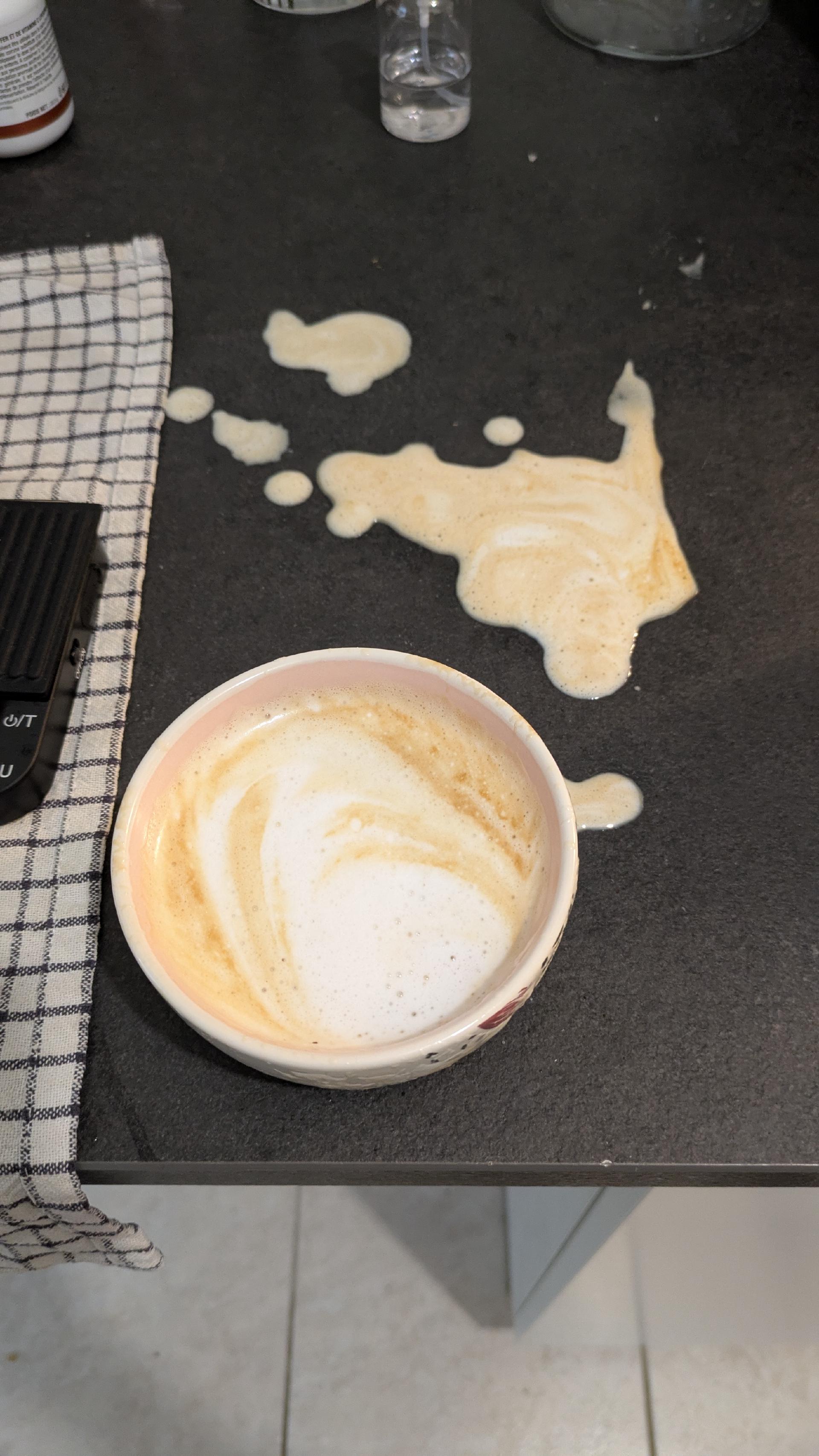 The result is certainly a bit better than before. But it’s still not where I want it to be. It has this noisy taste that’s both bitter and sour. Arguably a bit less than before but it’s still there. I didn’t take a picture of my first shot, but I have one of my first latte art for you. Stay humble friends.