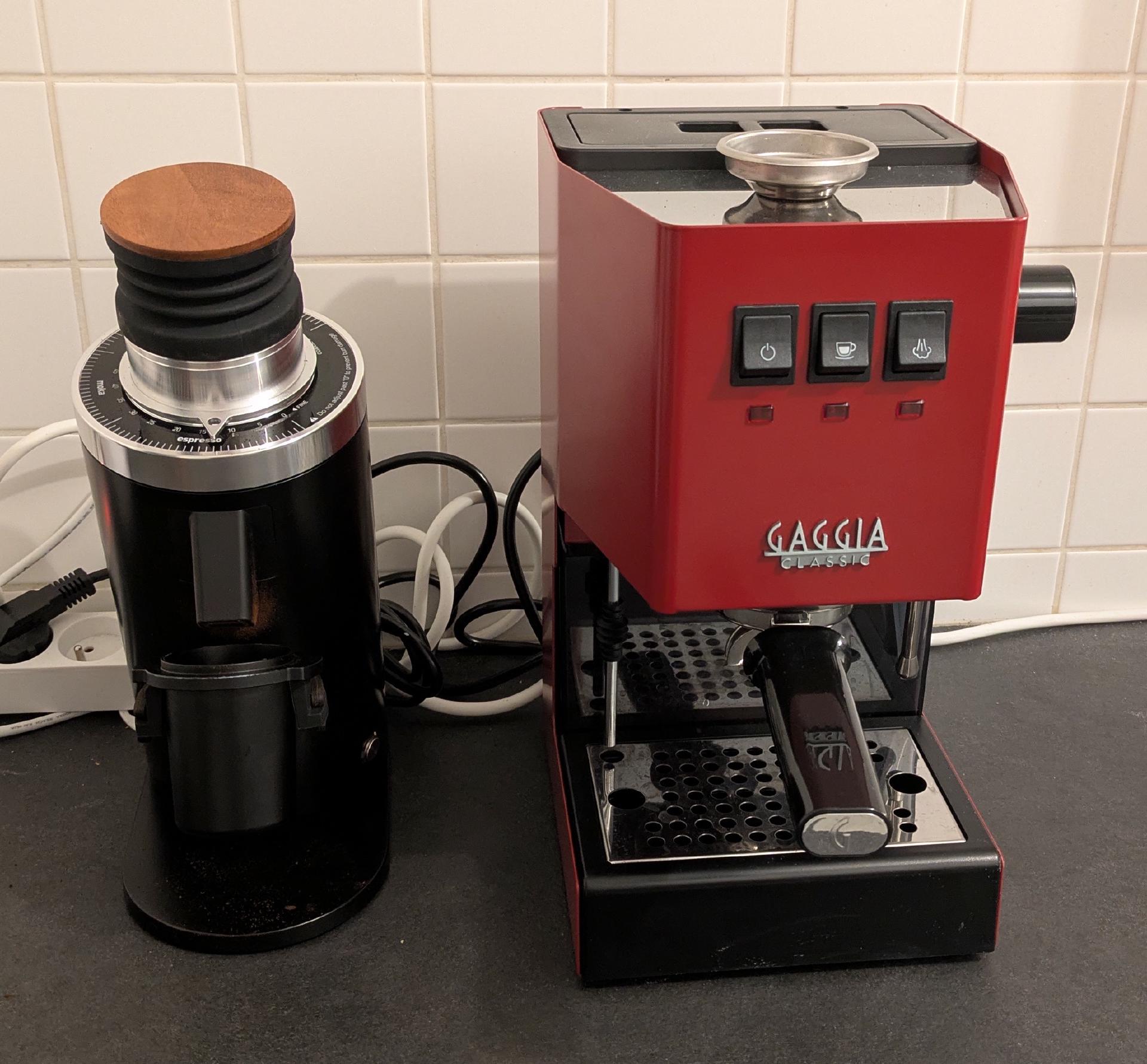 Finally. After weeks of research and painful days of waiting all pieces of my new coffee setup arrived by mail. I treated myself with a red Gaggia Classic Pro (E24 Version with brass boiler) and a DF64 grinder. I have a cheap coffee scale to weight the beans and the resulting cup of coffee. I’m using the stock filter basket and tamper that come with the Gaggia Classic.